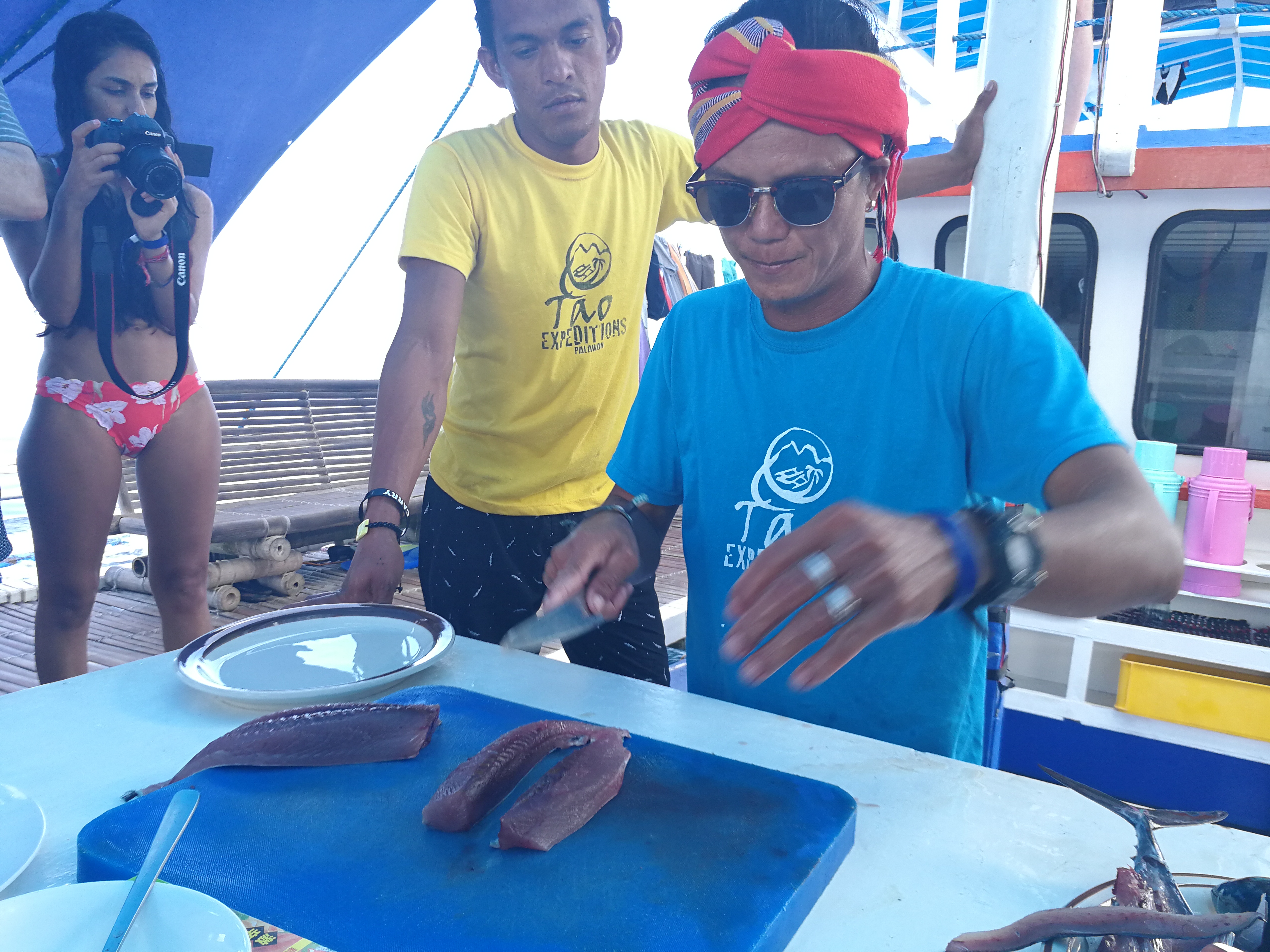 Wracając do wycieczki, Oli – kapitan naszej łodzi wieczorami opowiadał nam o życiu na Filipinach. Sam nigdy nie wyjechał z wysp – raz tylko był w Manili by zdać egzamin na kapitana, to mu wystarczyło. Był typowym piratem – jego życie to łódź i Tao. Można powiedzieć, że zakładał tą firmę. Miał 35 lat, trzy córki, każda z inną kobietą, 11 rodzeństwa. Na Filipinach nie ma emerytury – dzieci na starość utrzymują swoich rodziców. Przyrost naturalny jest bardzo duży. Oli mówił o sobie i załodze „lost boys” – zagubieni, porzuceni chłopcy. Życie na łodzi z inną gromadą turystów co 5 dni, przybijanie od wyspy do wyspy. Mówił, że każdy chce pływać w barwach Tao, a chętnych jest mnóstwo, bo zarobki w tej firmie w porównaniu ze średnią krajową są bardzo dobre. Na załogę rekrutują młodych, samotnych chłopaków. Szkolą ich przez dwa tygodnie, każdy z nich musi pokonać 2 km wpław. Są zwinny i są doskonałymi pływakami. I są wdzięczni, że mają taką pracę. To widać.