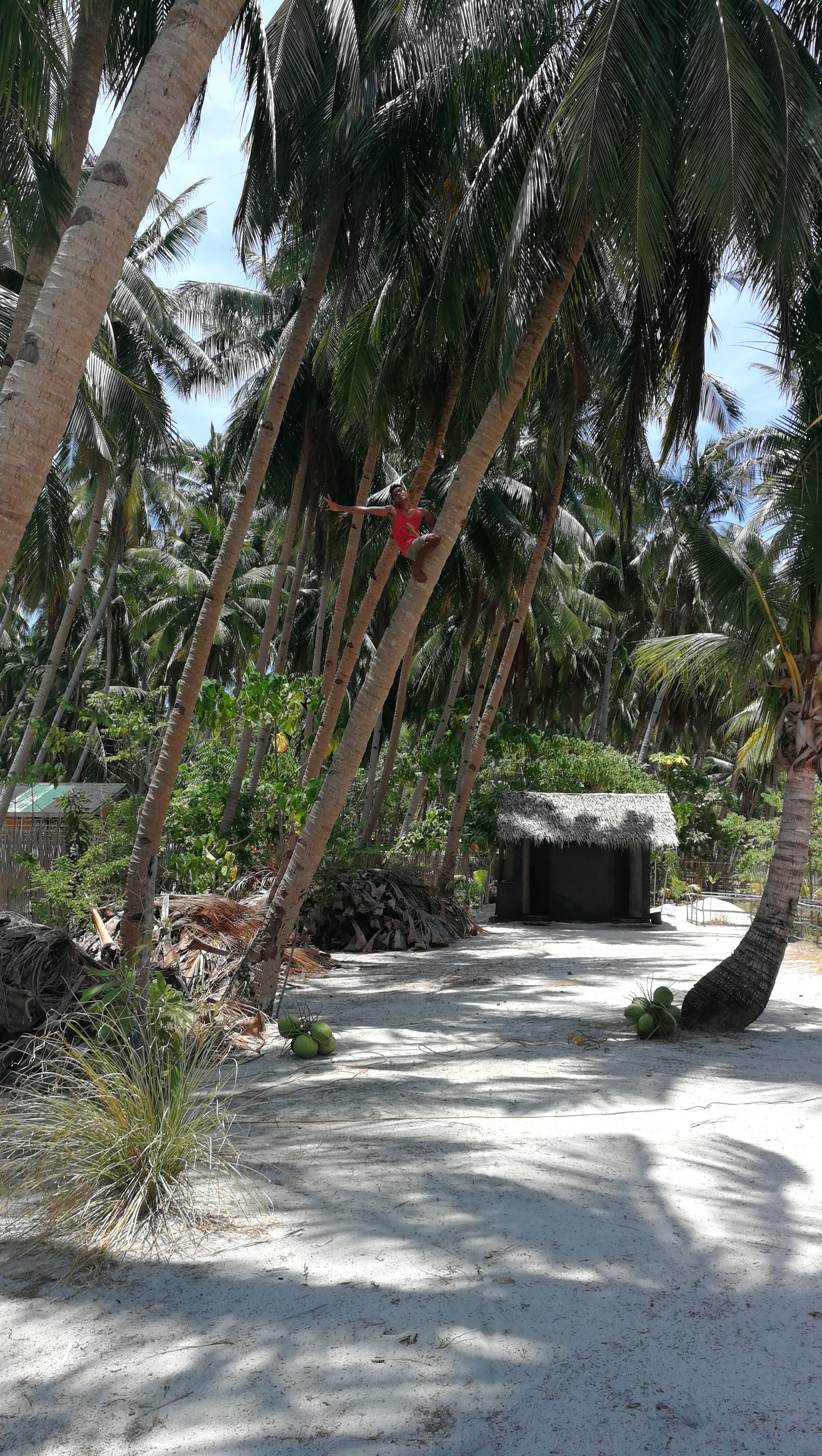 Wśród załogi jest Raul – to on zwykle bierze nas na kajak na wyspę. Jest bardzo szczupły i świetnie radzi sobie z angielskim. Płyniemy z nim na jedną z wysp. On również na niej zostaje. Po chwili widzimy jak bez żadnego zabezpieczenia wspina się na palmę wysoką na ok. 15 metrów. Ma tylko przypiętą maczetę do spodni. Nie wiem jak to się dzieje, ale mam wrażenie, że jego stopy wręcz przyklejają się do kory drzewa, a palce stóp wyginają się,by uchwycić za drobną krawędź. Gdy jest na szczycie palmy maczetą odcina wiązkę kokosów i spuszcza na dół. Upał ponad 40 stopni w samo południe, żar leje się z nieba. Raul obrabia jeszcze ze trzy palmy jeszcze wyższe od tej pierwszej. Schodzi zdyszany, odpoczywa trochę i wchodzi na następną. Pytamy się czy się nie boi, że spadnie. Odpowiada, że nie – wygląda jakby robił to od dziecka.