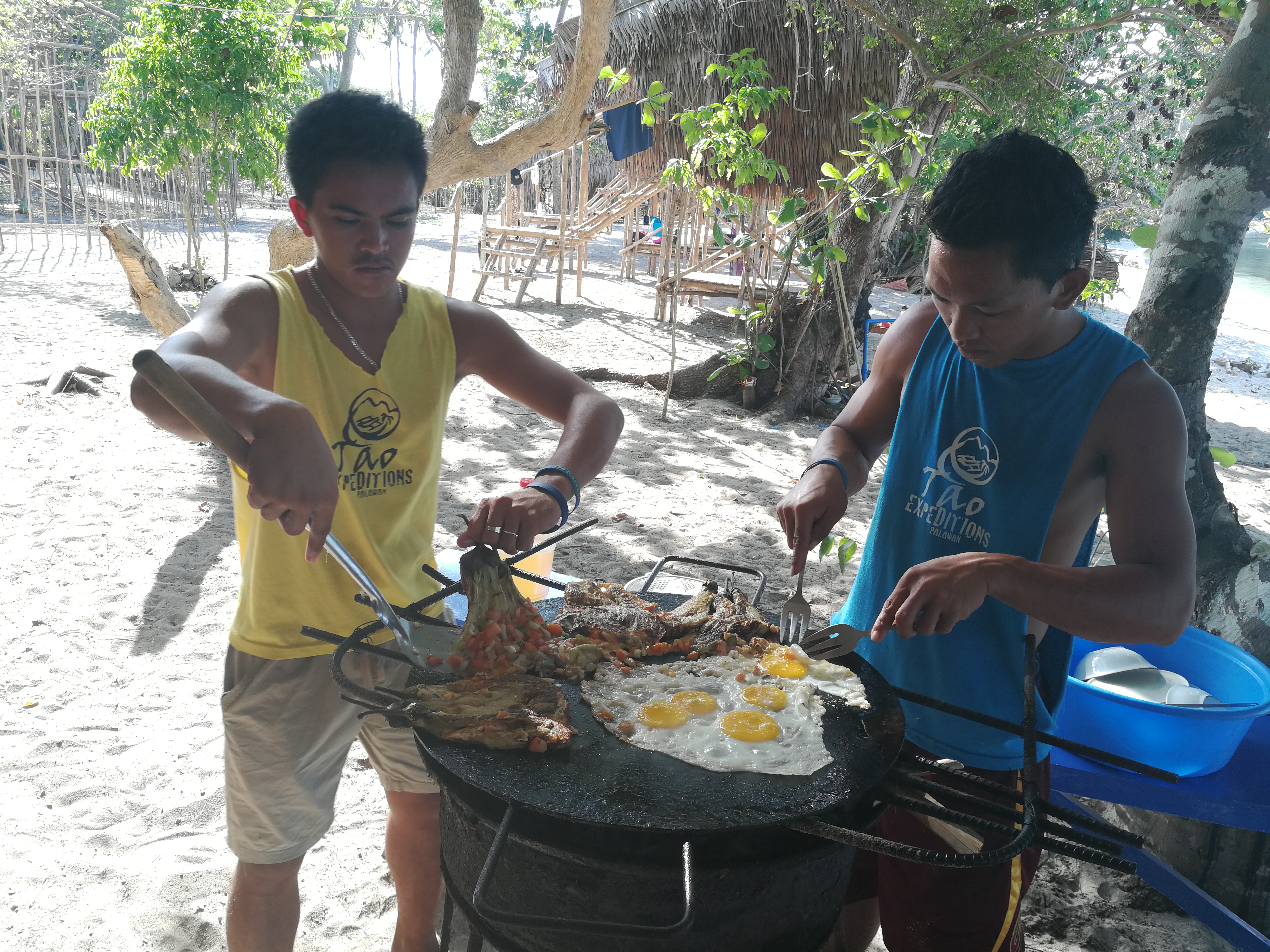 w szałasach, na materacach z rozwiniętą moskitierą. Największe wrażenie robi na mnie jednak główny obóz firmy. To tu załoga uczy się gotować, dbać o środowisko, uprawia się zioła, hoduje drób. W bazie głównej uczy się filipińskie kobiety masażu i wytwarzania bio kosmetyków. To tu też kucharze, którzy gotują nam na łodzi uczą się gotować od najlepszych mistrzów kuchni. Jedzenie jest przepyszne, naturalne. Nigdy nie bolał mnie brzuch. Szef kuchni zawsze po przygotowaniu jedzenia, opowiada nam co i w jaki sposób dzisiaj dla nas przyrządził.